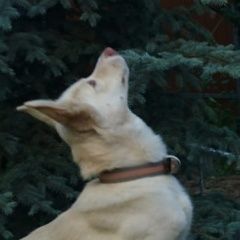 Кобель белой швейцарской овчарки, не чистопородный. Окрас светло-кремовый, оранжево-серый широкий ошейник, розовый нос, желтые глаза, около двух лет, Контактный, любит покушать - за еду готов на все, не сторож для дома..